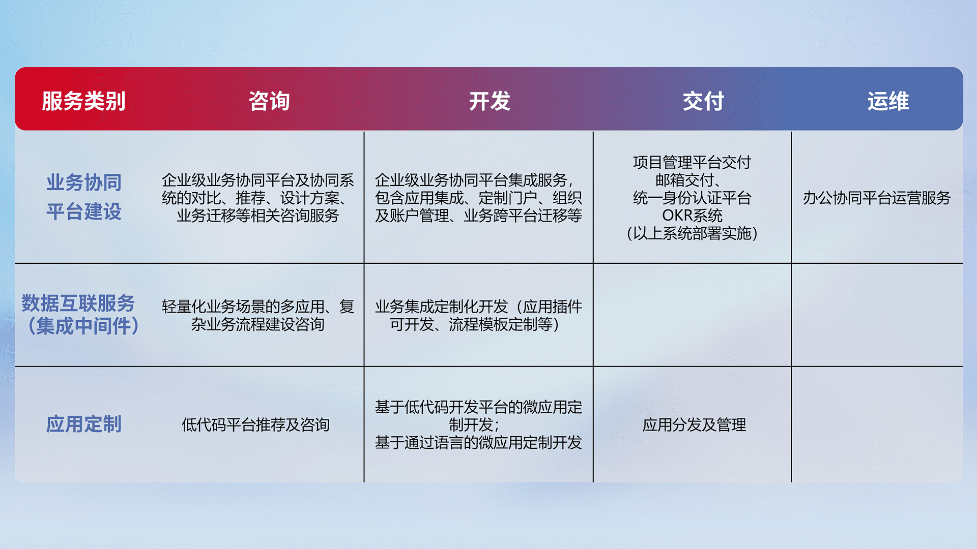 针对钉钉、、、企微、、IDaas等平台级产品提供产品的规划、、方案、、、交付、、、定制化开发等服务,,,,实现如统一协同办公、、、智能客户服务、、、混合会议管理、、、、智能数据查询、、、、等业务场景,,实现数字化转型。。。