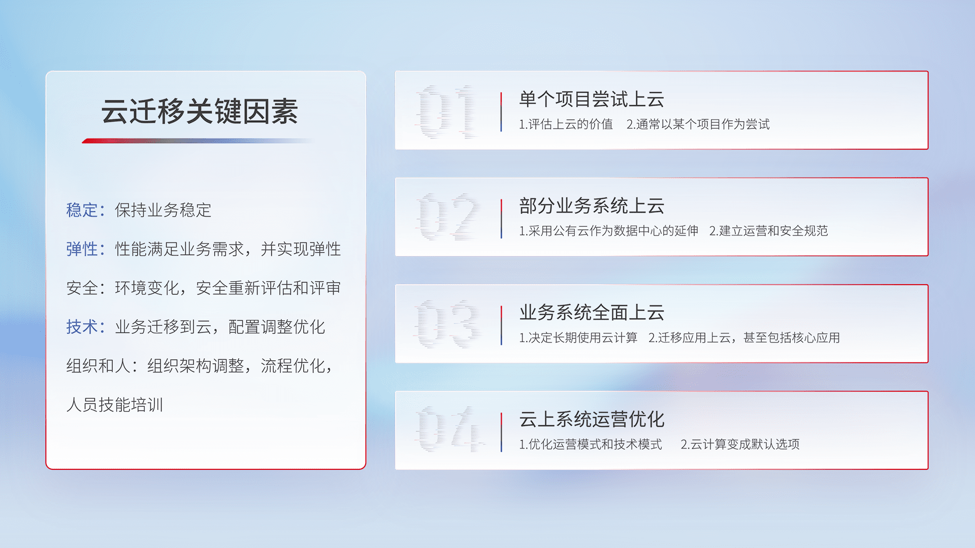 结合实际业务,,,从规划设计、、、云平台选型、、、云原生改造、、、、数据迁移、、集成交付,,,迁移全过程为客户识别最佳上云路径,,,,做好风险识别管理,,设计网络架构、、、、身份权限、、安全审计合规、、、操作审计、、、日志审计、、、监控告警策略、、多站点容灾设计等,,,对云上基础设施进行整体规划,,提升IT治理水平,,以满足弹性、、、高可用、、、、高性能的需求。。。