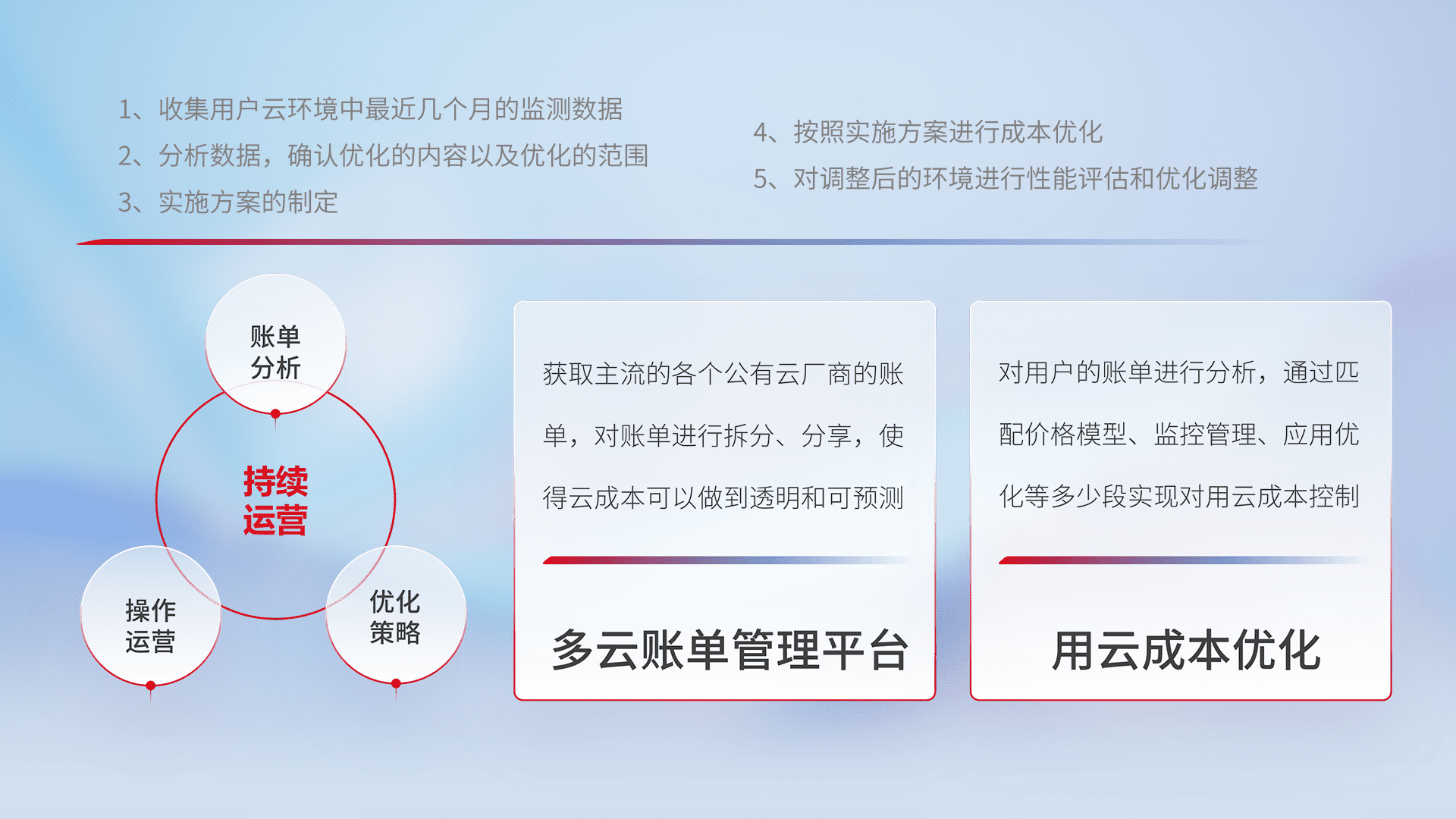 通过多云纳管,,,以统一的资源数据模型把客户的云资源进行抽象和封装,,,,进而实现对多云资源的统一操作,,,保障云资源管理的可靠性、、、稳定性与可用性。。量身定制化运维内容,,配置、、、、开发运维、、补丁管理、、、、备份、、、监控、、、、认证和访问管理、、审计和日常巡检等,,,,保障在用云过程中的可靠度,,,稳定度以及高可用率。。。。